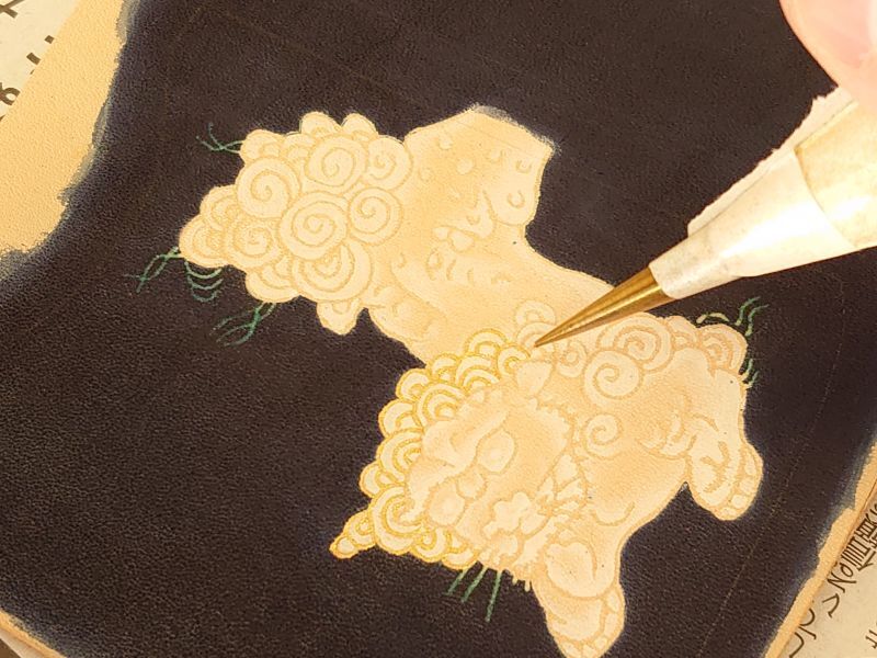 革 パスケース サンプルづくり2 2020年12月14日 手描友禅 革 パスケースサンプルづくり 獅子の彩色を終えて地色を染め、糸目糊を洗い落とします。 白濃淡のままでもカッコいいけど、少し金加工をします。 金を入れることで柄が締まって見えます。 糸目糊を落としたところ。このままでもカッコイイけど… 部分的に金加工して柄にしまりをつけます。 «前 次» 作者の日々