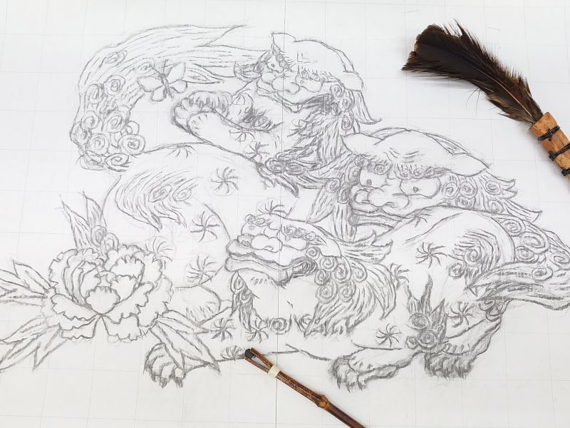 オーダーメイド 羽裏 親子獅子 草稿・下絵 2023年02月22日 オーダーメイド 羽裏 親子獅子草稿、下絵小下絵で描いたものを原寸大の大きさに拡大して描いていきます。私は高校の時に日本画を習ってたので、それと同じように木炭であたりをつけてその上を墨で清書していきます。清書できたら羽ぼうきで木炭をはらい落とします。草稿ができれば生地に下絵を写します。この生地は比較的薄くて下からライトで照らさなくてもわかるのですが、やはりライトで照らした方がしっかり見えるのでやり易いです。オーダーメイドのご相談はお気軽に。 木炭あたり 木炭あたり完成 草稿完成 «前 次» 作者の日々