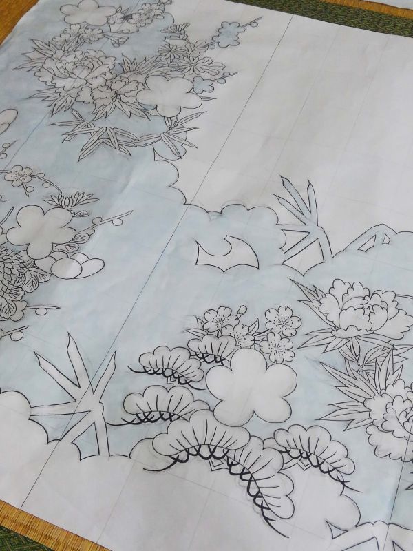 手描友禅は江戸時代(約18世紀)より受け継いできた、輪郭に糊を置いて、柄を絵画を描くように筆で彩色する染色技法です。