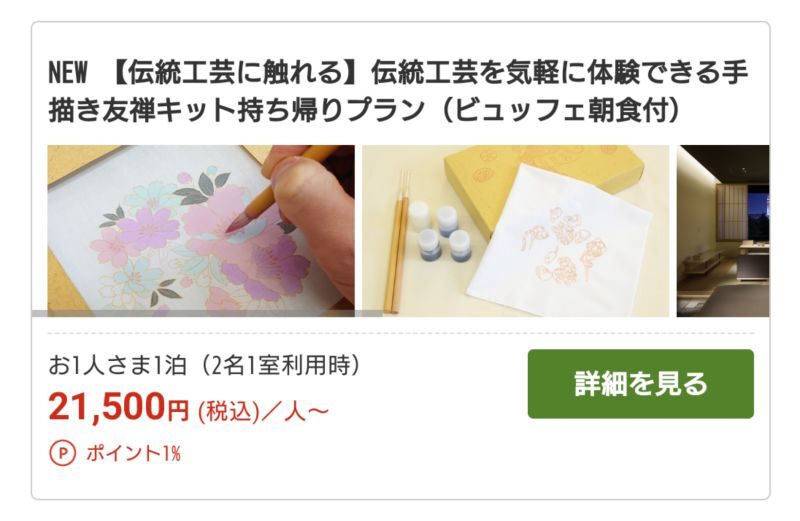ホテルカンラ京都さんで手描友禅体験キット付き宿泊プラン販売開始! 2023年06月15日 ホテルカンラ京都さんで手描友禅体験キットをプランとして使っていただいてます!京都へお越しの際はぜひ体験キット付きプランをご利用ください京都へ来た思い出や、お土産におうちで簡単、ハンカチに彩色体験!詳細はこちら下記URL楽天トラベルからhttps://hotel.travel.rakuten.co.jp/hotelinfo/plan/108734スクロールしてご覧ください «前 次» What's New