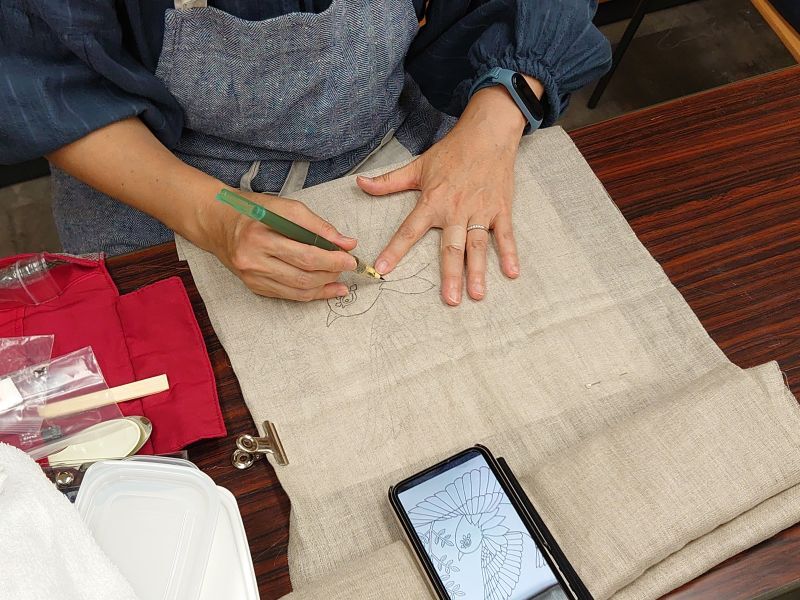 ストールは生成り色の上から作業するので下地に色がある彩色の感覚を知ってもらえます。