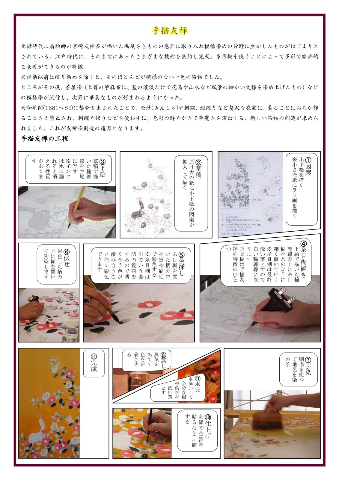 手描友禅の大きな特徴は糸目糊置きと色挿しで、糸目糊とは下絵を描いた輪郭線上に、もち米を主としたものや、ゴムでできた糊を置いていくことで、糸目糊が川でいう堤防の役割をしてとなりあう色がにじみあわなくなり、筆や刷毛を使って彩色する、色挿しをすることで絵画的な表現ができるようになりました。