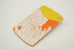 本体を橙色に、ポケットをボルドーに染め、そこに牡丹を描いたパスケース。