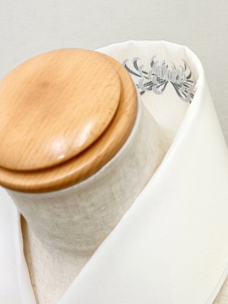 どんな着物にも合わせやすい白の半衿に、菊を描いています。